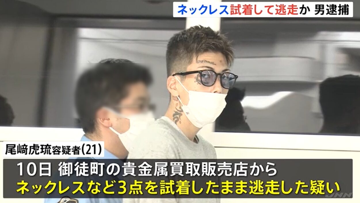 尾崎虎琉容疑者は、事件当日20代くらいの男性と2人で貴金属店に来店しています。この共犯者とされる男は、尾崎容疑者と共に高級ネックレスなどを試着したのち、尾崎容疑者が現行犯逮捕される一方で、そのまま逃走しています。